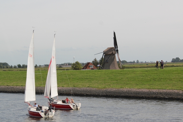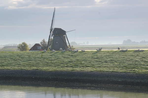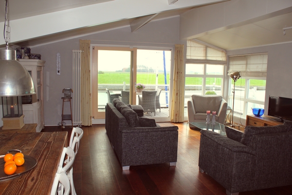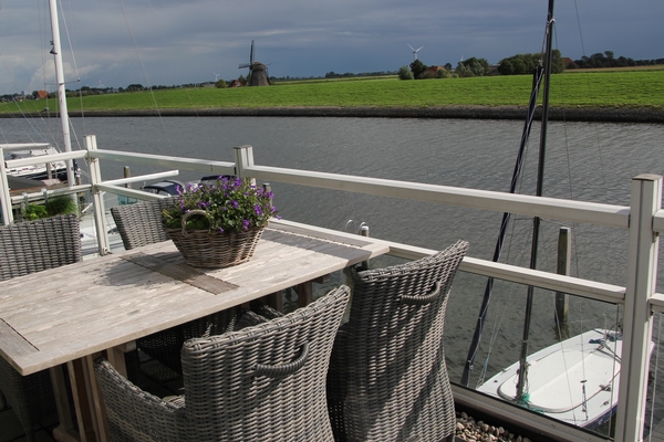 Von Oben, wo sich der Wohnraum befindet, ist die Aussicht prachtvoll. Man schaut aus dem Wohnzimmer oder von der Terrasse hinaus über den Deich in die Polderlandschaft mit einer alten Windmühle. Sie haben einen weiten Blick über das friesische Land, mit Schafen auf dem Deich und mit dem Kirchturm von Hindeloopen als Blickfang.