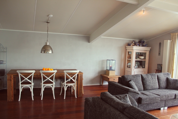 Das große Wohnzimmer (45 qm.) hat einen schönen Blick auf dem Wasser. Die viele Fenster machen den Wohnraum sehr hell. Das Wohnzimmer ist gemütlich und geschmackvoll eingerichtet mit zwei bequemen Sitzsofas und einem schönen stabilen Tisch mit acht Sitzplätzen. In einem robusten Holzschrank sind ein Fernseher, DVD und CD-Player eingebaut. WiFi ist kostenlos zu benutzen.