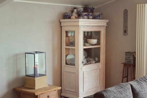 Een ruime hoeveelheid glaswerk, servies en bestek staat in de vitrinekast.