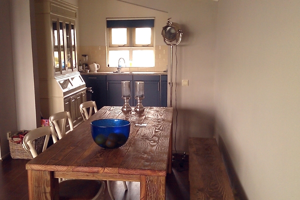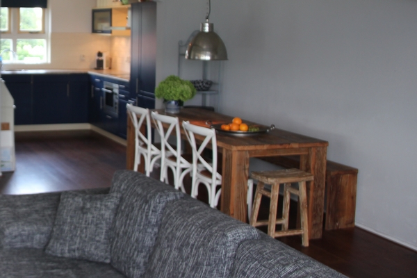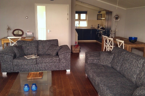 De riante woonkamer (45 m²) heeft een prachtig uitzicht op het water. Door de vele ramen is de woonkamer heerlijk licht. De woonkamer is sfeervol en smaakvol ingericht met twee comfortabel zittende banken, een prachtige robuuste eettafel met acht zitplaatsen. In een robuuste houten wandkast staan een TV, DVD-speler en CD-speler. Internet: WiFi is vrij te gebruiken.